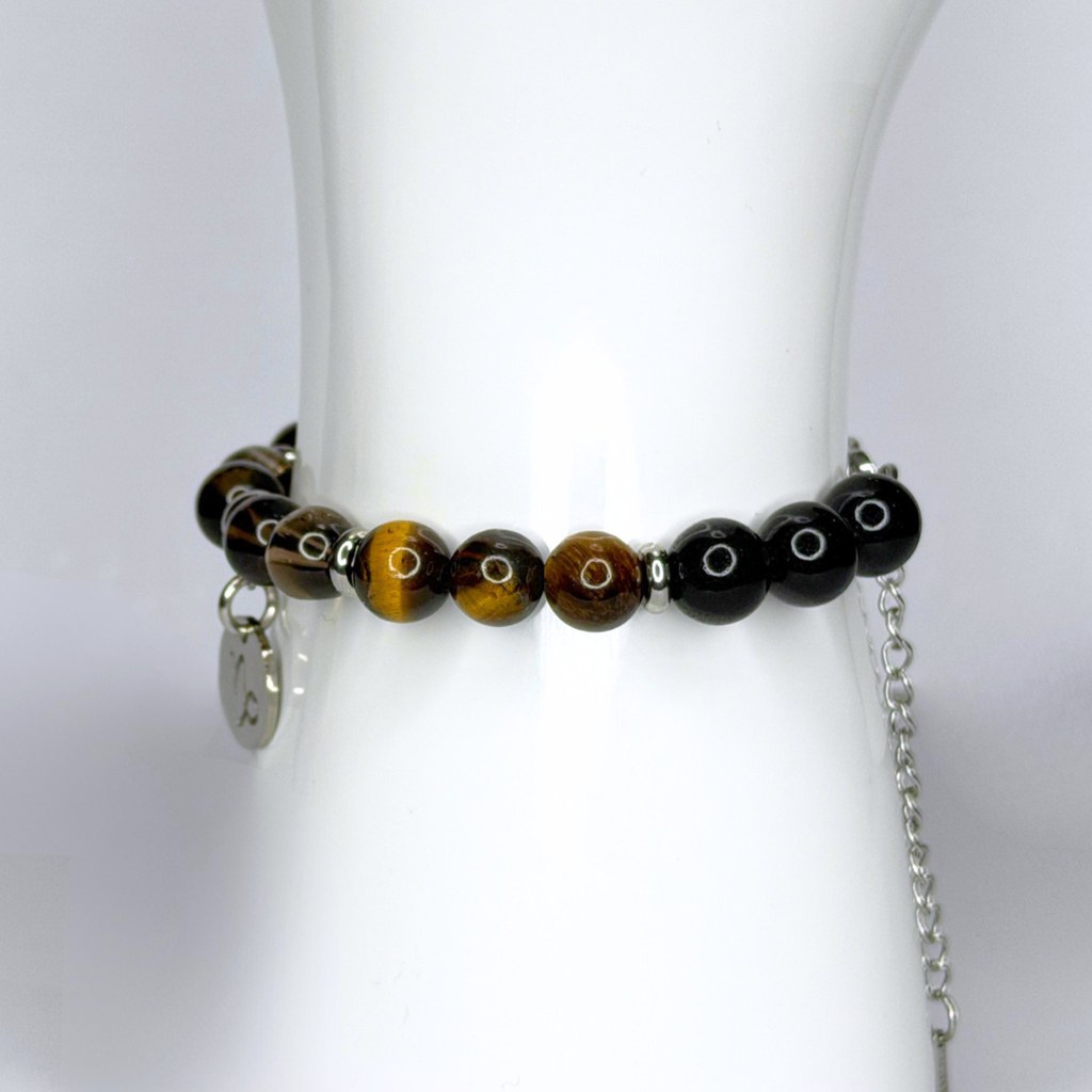 CAPRICORN ENERGY - BLACK ONYX, TIGER'S EYE AND SMOKY QUARTZ NATURAL STONE BEADS, LOBSTER CLASP + 2 IN. EXTENDER CHAIN STAINLESS STEEL