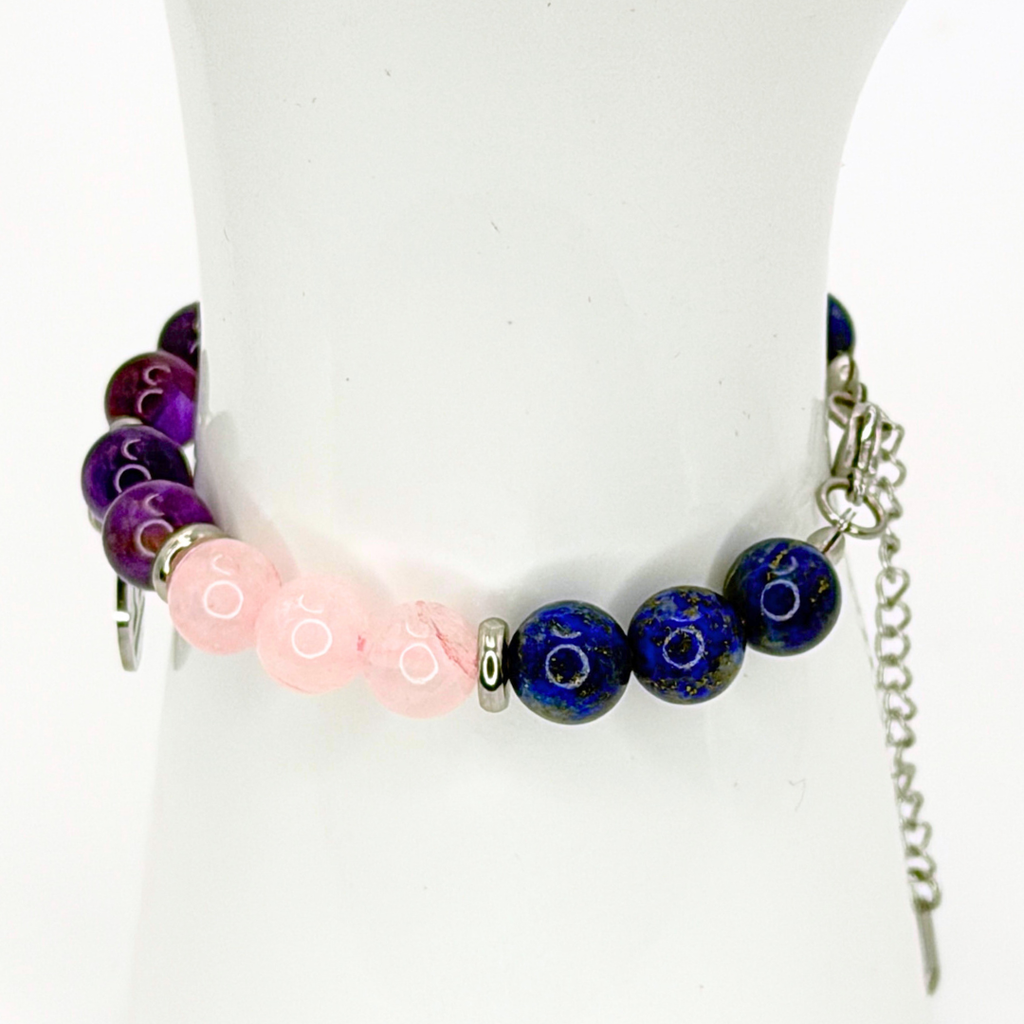 LIBRA ENERGY - LAPIS LAZULI, ROSE QUARTZ AND AMETHYST NATURAL STONE BEADS, LOBSTER CLASP + 2 IN. EXTENDER CHAIN STAINLESS STEEL