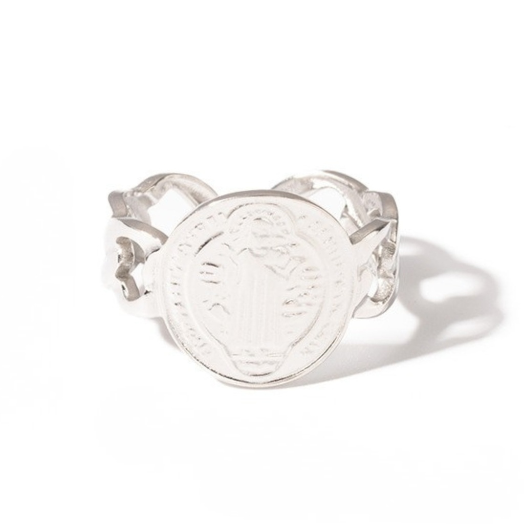 This open adjustable ring features the Saint Benedict medal engraved on the front, a powerful symbol of spiritual protection and strength. The back of the ring is smooth and blank maintaining a clean and minimal finish.